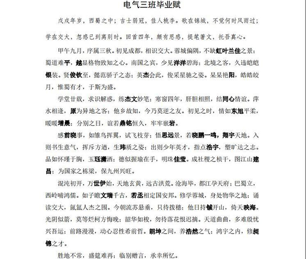 說寫就寫的王一鳴,僅用了一個下午就完成了這篇作品,發(fā)在班級群里,讓大家提提建議,同學(xué)們紛紛夸贊王一鳴有心、有文采,都說這是收到的最棒的畢業(yè)禮物,并且要把這篇《電氣三班畢業(yè)賦》印在畢業(yè)冊上。