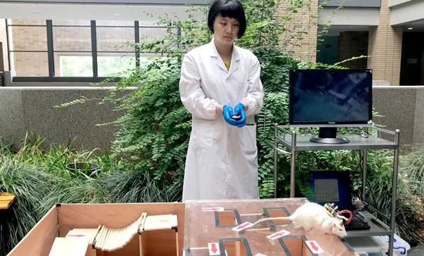 浙江大學(xué)求是高等研究院老師俞超楠演示通過(guò)微電刺激大鼠的感覺皮層產(chǎn)生虛擬觸覺實(shí)現(xiàn)對(duì)大鼠機(jī)器人轉(zhuǎn)向行為的控制。(謝沂楠攝)