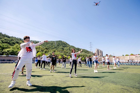 大連東軟信息學院軍訓期間,大二、大三學生組織快閃為新生打氣。東軟新聞社/供圖