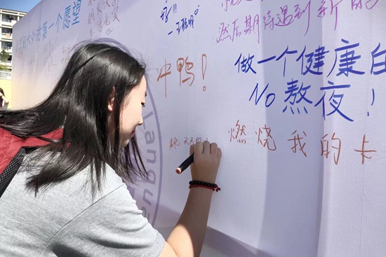 大連外國語大學新生在簽名墻上簽字。大連外國語大學融媒體中心 羅斕/攝