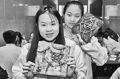山東煙臺王懿榮紀念館,菲律賓華裔青少年在展示制作的甲骨文“!弊帧P氯A社發(fā)