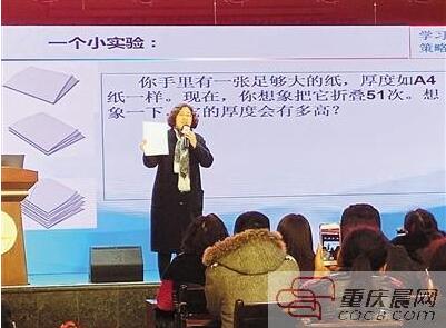 你手里有一張足夠大的紙,厚度如A4紙一樣,你能想象把它折疊51次,厚度會(huì)有多高嗎?昨日,中國心理學(xué)會(huì)會(huì)員、中科院心理所《學(xué)習(xí)策略研究》課題組成員朱淑玲來到渝中區(qū)中華路小學(xué),與大家分享如何做一名智慧的學(xué)習(xí)型家長。