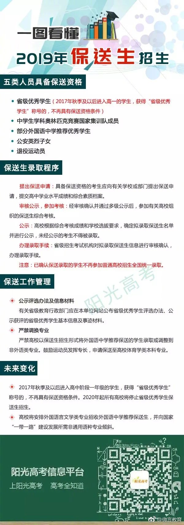 一圖看懂2019年保送生招生 你符合條件么?,(記者 何淼)據(jù)教育部官方微博消息,2019年高校招收保送生工作已拉開帷幕。教育部推出圖解具體說明高校招收保送生工作,其中包含保送生資格、錄取程序、招生變化等內(nèi)容。看圖↓↓ 。ń逃啃侣勣k官方微博截圖)