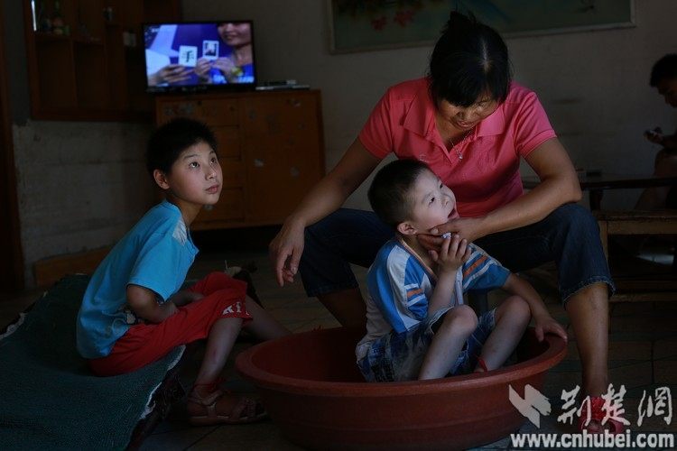 武漢東湖開發(fā)區(qū)左嶺街金王村有52戶是寄養(yǎng)家庭 ,其中多數(shù)是一家寄養(yǎng)兩名孤殘兒童,人稱“寄養(yǎng)村”,這是武漢市兒童福利院唯一位于遠郊的寄養(yǎng)點。福利院每月給寄養(yǎng)家庭提供一定的生活費、護理費,社工們每周走訪寄養(yǎng)家庭。福利院還在村里建起兒童活動中心,聘請老師開課,讓有學習能力的13名孤殘孩子學習文化。身體的殘疾限制了寄養(yǎng)兒童們的活動天地,生活有時無聊。多動的武振爽最喜歡的游戲是坐在洗腳盆里玩,武凌彩和寄養(yǎng)媽媽吳秀云在一旁發(fā)呆。圖片來源:荊楚網(wǎng)