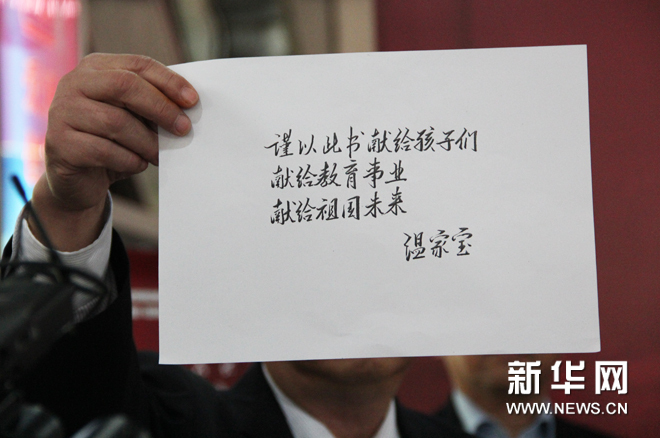 10月31日,《溫家寶談教育》新書首發(fā)式在北京西單圖書大廈舉行。主辦方展示了溫家寶同志親筆寫下的出版寄語。新華網(wǎng) 王志艷 攝
