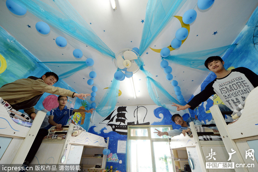2013年10月26日,重慶西南大學學生會舉辦了一場新生宿舍美化大賽,數(shù)以千計的新生參與。許多創(chuàng)意獨特的95后,花了不到200元,就把寢室裝出了高端洋氣上檔次的格調。卡通賣萌、奇幻漂流、文藝范兒……來看看他們的宿舍風格與背后的故事吧?蓯劭ㄍ▔γ咳擞忻让奚幔航(jīng)濟管理學院工商管理專業(yè)大一男生宿舍竹園C棟316室花費:不超過100元,主要花費在顏料紙張上畫著卡通小黃人的墻、維尼熊馬克杯、小螞蟻粉T恤……若不是墻角散落著的幾只略有味道的球鞋,你很難將眼前這間宿舍與男生聯(lián)系在一起。這間宿舍萌至如此,必須歸功一個人:宿舍的賣萌小王子詹鑫豪。自打入校的第一天起,發(fā)嗲、買各類賣萌產(chǎn)品……詹同學盡顯賣萌本色。在他的影響下,宿舍其他5個哥們也發(fā)現(xiàn)了自己的賣萌天分,集體賣萌成了宿舍的風氣。比如:大家集體購買了一系列風格迥異的卡通睡衣,包括奶牛版、熊貓版等;再比如,大家有了一個個超萌的外號:大狼、肥羊、猴子、毛毛、嚶。在寢室美化設計時,詹鑫豪出力不少!拔覀冇媱澰趬ι袭孅c東西,但別的東西都好難畫,我突然想到近期看的動畫片《卑鄙的我》里的小黃人,不是正好又萌又簡單嗎?”全宿舍一致認可這個提案,詹鑫豪更主動承擔起為小黃人上色的任務。自稱“不擅賣萌”的周密同學表示,“相比很多同齡人,我們宿舍顯得比較幼稚。但用萌這種方式記錄生活,算是青春記憶吧。”紫紗式童話茶道來相伴宿舍:外國語學院免師英語專業(yè)大一7班女生宿舍桃園1棟201室花費:不超過200元,主要用于買卡通畫和紫紗擁有一個童話古堡,是萬千少女的夢想,英語班的幾位同學把它變成了現(xiàn)實。最初,室長吳倩一提議走公主風,立馬獲得壓倒性的支持。此后給宿舍起名字、設計細節(jié)等,遇到意見不一致時,都是以少數(shù)服從多數(shù)為原則,“但有一點:不能放馬后炮!备髯砸鹿裆系木S尼熊、米老鼠,搭在蚊帳上的層層紫色紗布,甚至在廁所門前專門貼了一張公主畫……公主風鋪天蓋地而來。這間宿舍在全院打響名號,除了夢幻的布置,還離不開室友袁凡的宣傳。宿舍里兩套精致的茶幾頗引人注目,它們的主人、被同學們盛贊為“茶神”的妹子來自云南,家鄉(xiāng)盛產(chǎn)普洱茶,“我們家很多人是茶文化愛好者。我平時泡了茶,就會喊大家來喝,享受泡茶、品茶的過程!睍r光軸愛上照片墻宿舍:經(jīng)濟管理學院農(nóng)業(yè)經(jīng)濟管理大一1班女生宿舍南苑9舍525室花費:不超過200元,錢主要用在購買顏料、卡紙等上愛拍照、愛旅游、愛泡咖啡館……在王麗君看來,宿舍姐妹們雖然性格有靜有動,但或多或少都有顆文藝的心。這也很好地解釋了為什么舍長宋錦雯一提議宿舍美化走文藝范,大家都舉雙手贊成!安蝗绾腿巳司W(wǎng)一樣,我們也建一個實體版的時光軸”、“不如我們貼上黃色的墻紙,讓宿舍看起來像個咖啡館”……確立主題后,舍友們你一言我一語開始構思細節(jié)。很快,時光軸火速出爐,事后它確實成為了宿舍的一大標志。時光軸的主材料是涼席和各張打印出來的照片以及文字解說。時光軸上,記錄了大家相處的兩個多月美好時光。王麗君向記者介紹,“第一張是軍訓開始前在宿舍的第一張合影,第二張是軍訓拉練時我們疲憊狀態(tài)下的自拍,第三張是班級第一次聚餐,我們宿舍的坐在一起……”談起“時光軸”的未來,王麗君表示,“我們都是自拍狂,也特別喜歡記錄生活的點點滴滴,所以未來肯定會有更多精彩照片,我們還會分享出來,當然那時我們可以選擺更美的照片!