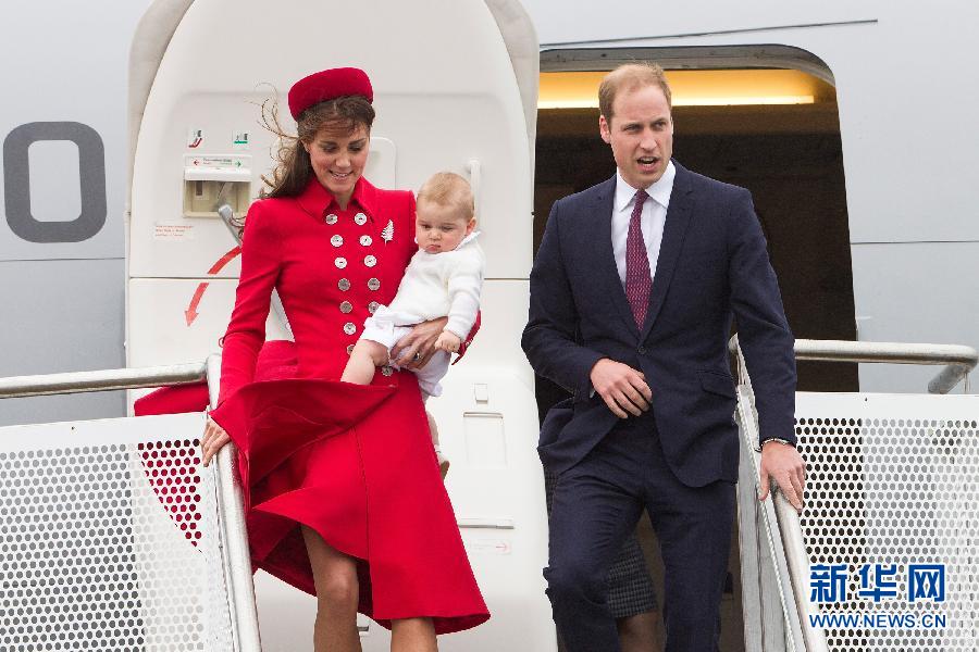 4月7日,在新西蘭惠靈頓,英國威廉王子(右)和凱特王妃帶著他們的寶寶喬治王子走下飛機。當日,小王子跟隨父母展開了他人生中的第一次出國旅行。威廉王子夫婦將對新西蘭進行10天的訪問。 新華社發(fā)(戴維·羅蘭德攝)