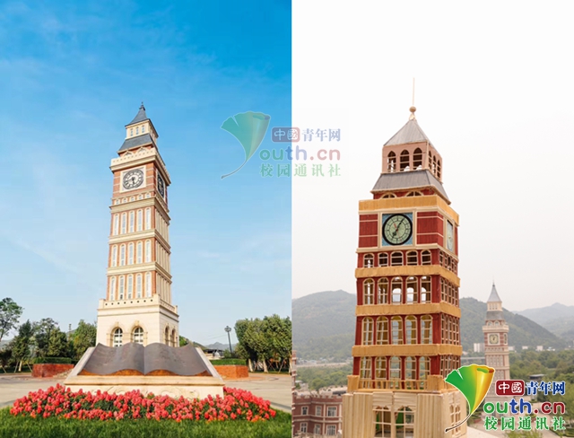圖為學(xué)校“鐘樓”與學(xué)生制作的“鐘樓”對(duì)比 (學(xué)校供圖)