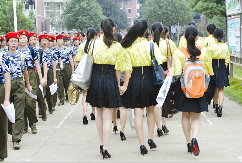 圖為:常規(guī)軍訓生們投來好奇的目光。