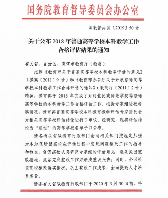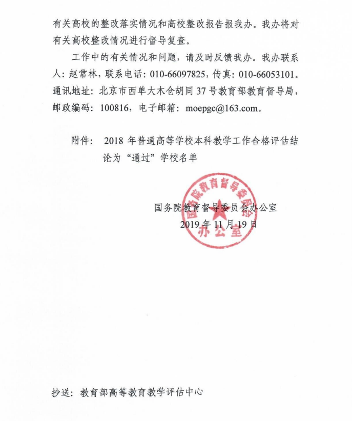 近日,國(guó)務(wù)院教育督導(dǎo)委員會(huì)辦公室正式發(fā)布了《關(guān)于公布2018年普通高等學(xué)校本科教學(xué)工作合格評(píng)估結(jié)果的通知》(國(guó)教督辦函〔2019〕50號(hào)),武昌理工學(xué)院順利通過(guò)教育部本科教學(xué)工作合格評(píng)估,這是武昌理工學(xué)院發(fā)展史上具有里程碑意義的重大事件,標(biāo)志著學(xué)校發(fā)展邁向了新臺(tái)階、開(kāi)啟了新征程、進(jìn)入了新時(shí)代。
