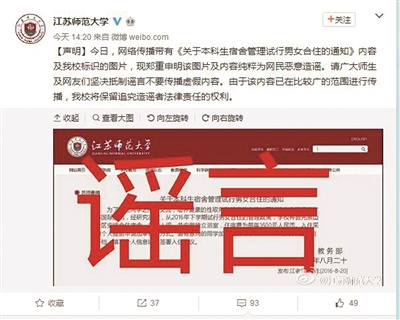 8月20日上午,一條截圖在微信朋友圈迅速傳開。截圖顯示是江蘇師范大學(xué)官網(wǎng)發(fā)布的一條通知,通知稱校方共2016年第二學(xué)期開始,可以申請男女合住。由于該內(nèi)容已在比較廣的范圍進(jìn)行傳播,我校將保留追究造謠者法律責(zé)任的權(quán)利。