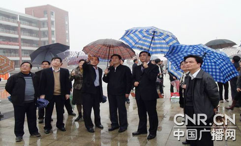校長吳華安(前排右)陪同江西省副省長孫剛(第二排中)、新余市委書記李安澤(第二排右)、新余市委常委宣傳部長廖蘭芳(第二排左二)、分宜縣委常委宣傳部長李冰平(第三排左一)、分宜縣副縣長李華(第二排左一)到學校檢查指導工作 從辦學條件上看,根據(jù)多年的生源分析,再興建一所招生規(guī)模達4500人的學校,加上現(xiàn)有的分宜二中、三中、五中和一中初中部,完全能夠滿足所有初中生進城。從經(jīng)濟條件上看,實施“初中進城”工程,新建第六中學約需投資1.2億元,每年運轉經(jīng)費100萬元左右,縣財政完全有能力承擔。從交通條件上看,近幾年通過大力實施村村通油路、通客車工程,全縣實現(xiàn)了100%的村委通油路、通客車,距離縣城最遠的村莊進城只需50分鐘,學生進城返家都很方便。 記者:初中進城,讓農家子弟享受到公平教育,請問軟件和硬件方面得到哪些改善?體現(xiàn)在哪些地方? 吳華安:通過實施初中進城方案,分宜六中這所投資1.2億元、占地面積為186畝、建筑面積為64766平方米的新學校,硬件設施在周邊地市走在前面,甚至與沿海城市相比也并不遜色,尤其是學校的內部設施也極大提升:政府投資給老師每人配了一臺手提電腦,每個教室都安裝了多媒體投影儀,還有理化生實驗室、儀器室、微機室、語音室、廣播室、閱覽室、監(jiān)控室、音體美教室、室內體育館、室外運動場等,都是按照國家標準高質量進行裝備。 與硬件建設相比,軟件建設更讓學生滿意。為配強師資,2010年,分宜縣從農村中學選調了180名教師及面向社會招考44名教師進校任教。目前,分宜六中有教職工230人,其中本科學歷占73.4%,達標率為100%。 圍繞辦成“江西一流,獨具特色的初中進城示范!,學校實行寄宿制全封閉管理,全部學生免費住宿,并配備了生活教師,與學生同吃同住,24小時親情監(jiān)護。為了充分保護學生的安全,學校完善安全機構和各種制度。加強監(jiān)督和檢查,消除各種安全隱患,致力營造良好的學習生活環(huán)境,制度化、規(guī)范化、人文化的管理模式日漸形成,讓農家子弟與城市孩子享受到了同等的教育質量,農村學生的綜合素質得到很大的提高。 記者:初中進城,讓農家子弟享受到與城里一樣的優(yōu)質教育資源,請問學生要多出費用嗎?這樣會不會增加農民的經(jīng)濟負擔呢? 吳華安:剛開始,許多農民在電視、廣播上看到政府花了一個多億建了一所這么漂亮的學校,學費肯定很貴。9月開學之初,當學生家長在報到時,得知自己只要交空白作業(yè)本費9.25元,家長說什么也不相信這是事實。 其實,原先農民的這些擔心很正常。分宜六中的建校成本由政府承擔,學生進城讀書增加的支出有限。為使學校輕裝上陣,政府每年補助學校水電費120萬元,給予學校20名臨時用工指標,每人每年財政安排預算1.2萬元,計24萬元。 學生住的是公寓,24小時供應熱水,熱水供應實行智能化管理,一生一卡,一個學生洗一次熱水澡只要電費成本費0.15元。
