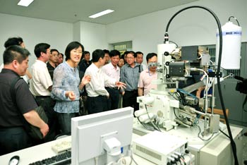 會前,在重點實驗室副主任、科技處處長許小紅教授的引導(dǎo)和介紹下,各位專家學(xué)者參觀了我校冷場發(fā)射掃描電鏡室、磁性測量室、原子力顯微鏡室、薄膜制備實驗室、氣(液)色譜室、發(fā)射(吸收)光譜等實驗室,大家對我校的實驗條件和科研團(tuán)隊建設(shè)表現(xiàn)出極大的興趣,對我校重視科研、吸引人才的舉措留下了深刻的印象。