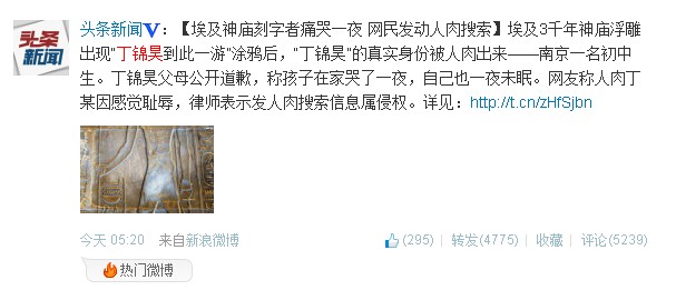 當(dāng)我們回過頭來再思考一下整個事件,對于丁錦昊而言,無疑他犯了錯誤,他讓有3500年歷史的盧克索神廟在哭泣了,在丁錦昊與它那場跨越千年的對話中它蒙羞了,它已走過了三千多年的漫長歲月,在公元2013年卻被刻上了永不可抹去的傷痕。但之后網(wǎng)友的人肉搜索和口誅筆伐對于一個13歲的孩子是否過于殘忍了?
