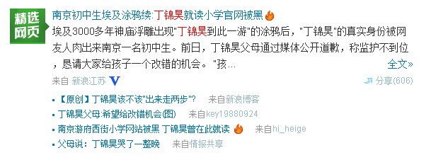 在5月24日丁錦昊“到此一游”事件曝光后,輿論引起軒然大波。至5月25日晚11點,評論已達11000多條,轉(zhuǎn)發(fā)達到83000多條,網(wǎng)上的相關(guān)評論則達數(shù)十萬條,而主題詞就是中國游客的“素質(zhì)”。在譴責(zé)這種不文明行為的同時,也有網(wǎng)友“人肉”出,丁錦昊是南京某中學(xué)在讀的初一學(xué)生等個人信息。而網(wǎng)友對于丁錦輝的聲討更是一浪高過一浪。 5月25日,丁錦昊的父母主動站出來發(fā)聲,在為孩子的行為道歉的同時,也懇請得到改正的機會,并透露,題字風(fēng)波發(fā)酵后,孩子哭了一整夜。至此,丁錦昊“到此一游”事件算是暫時告一段亂。