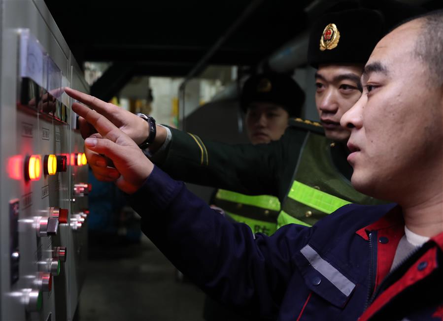 •      大連灣邊防派出所官兵鄒坤(右二)等在一家食品公司檢查安全生產(chǎn)工作(1月2日攝)。新華社記者 李鋼 攝