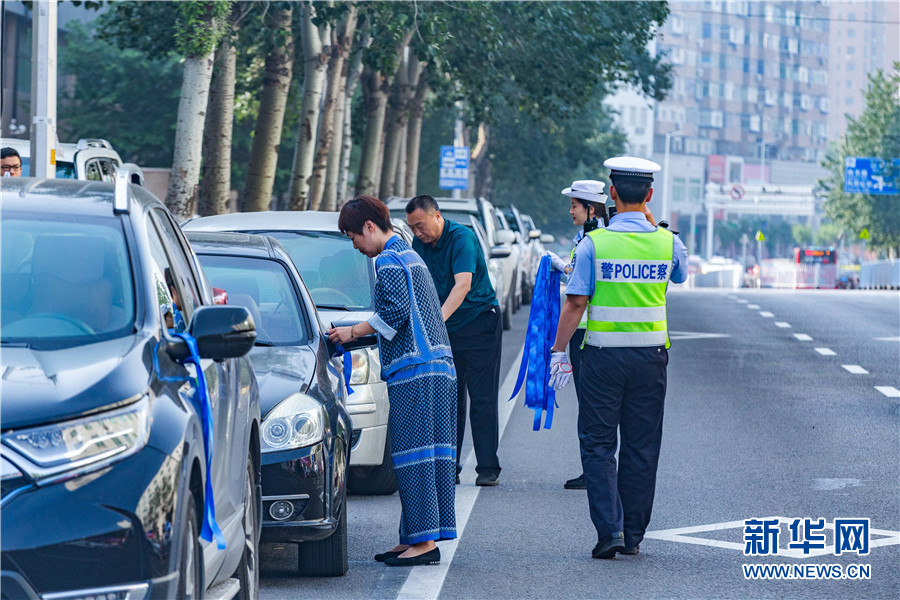 孩子們好好考 我們?yōu)槟慵佑?6月7日,2019年高考正式開始。沈陽市各考點(diǎn)外,交警、陪考老師、考生家長紛紛用自己的方式為考生加油打氣,助力高考。為了給廣大考生在考試期間創(chuàng)造優(yōu)良的交通環(huán)境,沈陽公安交警全警出動(dòng),維持考場周圍交通秩序,并推出“藍(lán)絲帶行動(dòng)”等多項(xiàng)舉措,為高考學(xué)子保駕護(hù)航。圖為交警為考生家長發(fā)放藍(lán)絲帶。新華網(wǎng)李忠樺攝