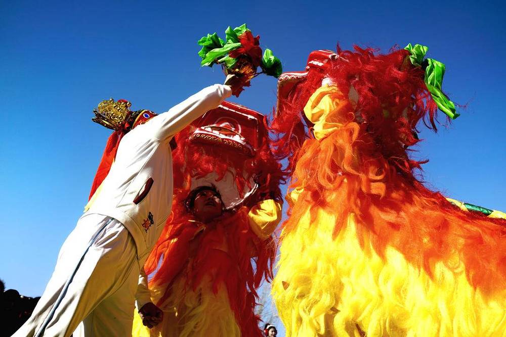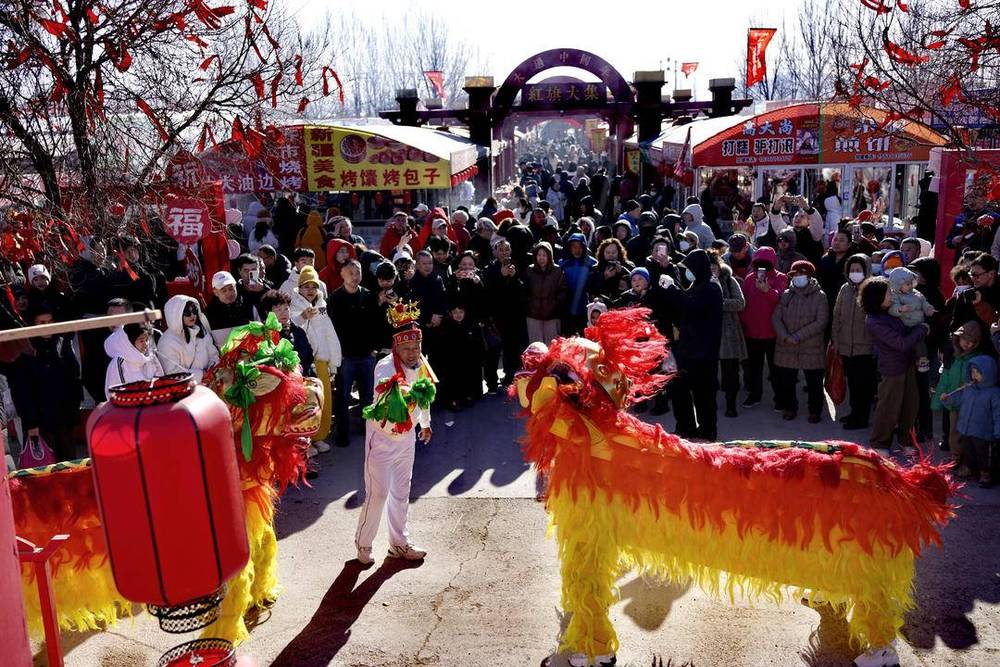 集市上人潮涌動,處處洋溢著喜慶氛圍。舞獅表演輪番上演,紅黃獅身躍動翻騰,鼓點鏗鏘間點燃現(xiàn)場熱情;特色攤位前,現(xiàn)灌血腸、鮮肉串、糖畫等美食飄香,攤主的吆喝聲與顧客的歡笑聲交織。