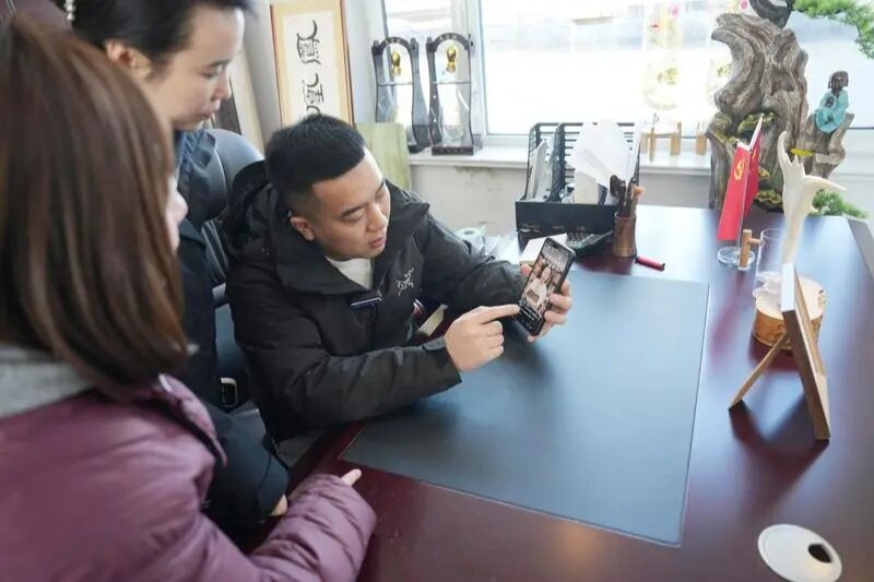 源育鹿業(yè)負(fù)責(zé)人宋源育(右)向記者介紹電商直播情況(鐵嶺市委宣傳部供圖)