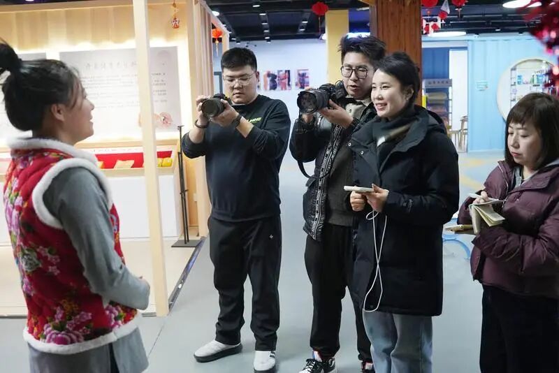 鹿鄉(xiāng)綠港電商直播基地助播(左)向記者介紹情況(鐵嶺市委宣傳部供圖)