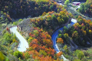 “這條路全長(zhǎng)53.5公里,起點(diǎn)是昌金路北寨路口,途經(jīng)四座樓山,終點(diǎn)是熊兒寨鄉(xiāng)花峪村!逼焦葏^(qū)體育局文秘室主任張全力告訴記者。在這條寬7.5米的鄉(xiāng)村三級(jí)標(biāo)準(zhǔn)道路上,三分之二路程為瀝青路面,其余多為水泥路面,深山之中還有小部分為沙石道路。2009年4月建成后,已漸漸成為平谷區(qū)和部分北京市徒步愛(ài)好者的首選之地,至今已連續(xù)4年舉辦了全國(guó)性休閑健身大會(huì)。 一場(chǎng)秋雨過(guò)后,金風(fēng)乍起,正應(yīng)了“況屬高風(fēng)晚,山山黃葉飛”的意境。站在山頂眺望,道路迂回,如絲帶般盤轉(zhuǎn)在山體上。張全力說(shuō):“這條路已經(jīng)頗有些名氣了,附近有京東大峽谷、石林峽、三羊古火山等名勝風(fēng)景區(qū),還有燕國(guó)石長(zhǎng)城、明長(zhǎng)城烽火臺(tái)等古跡,總體植被覆蓋率大約為67%,最高的地方為85%,稱得上是一條生態(tài)大道!