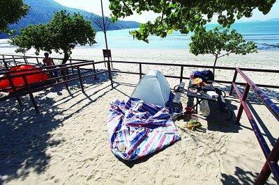 一番折騰之后,胡冰他們終于在去年4月的某日抵達(dá)香港,然后按圖索驥直奔大嶼山貝澳海灘!昂茼樌驼业搅寺稜I(yíng)地,因?yàn)椴皇侵苣,幾十個(gè)營(yíng)位大多是空的,我們隨意選了一個(gè)開(kāi)始安營(yíng)扎寨!