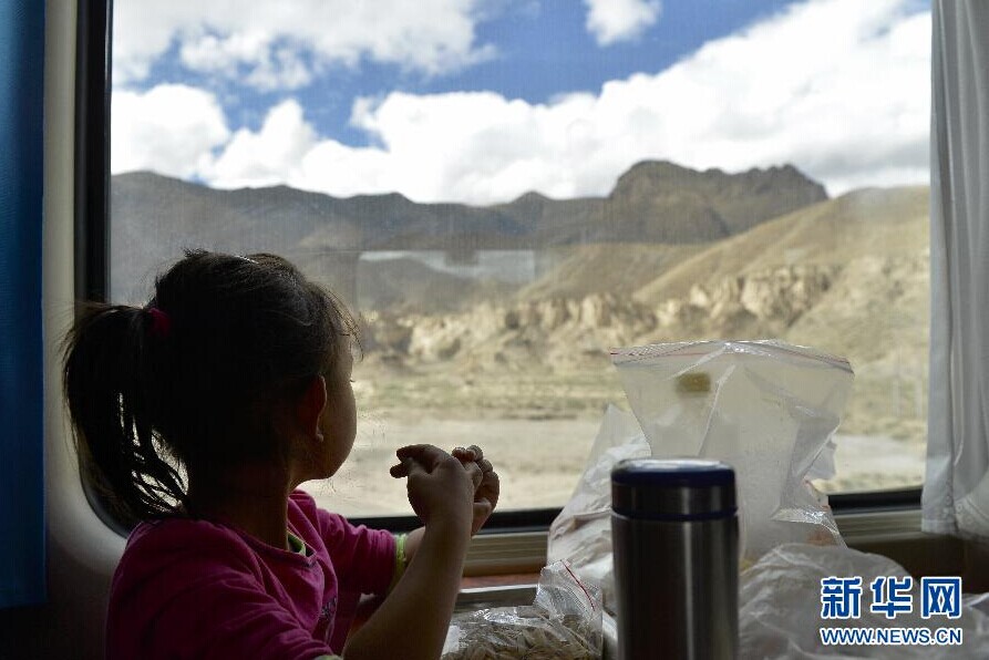 來自拉薩的5歲小朋友旦增敏吉在乘坐拉日鐵路客運列車(8月1日攝)。拉日鐵路連接拉薩與西藏第二大城市日喀則,是青藏鐵路的首條延伸路段。據(jù)一名列車長介紹,以前從拉薩到日喀則開車需要六七個小時,而自拉日鐵路開通運營以來,拉薩到日喀則只需三個小時,顯著改善了當(dāng)?shù)厝嗣竦某鲂袟l件。新華社記者 劉東君 攝