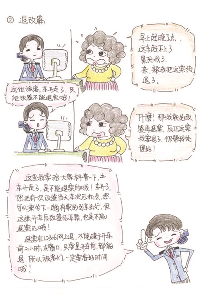 漫畫由人物對話組成,截取了一個個鮮活的場景,并在結尾處給予提醒。這些漫畫出自一名鐵路一線的售票員江西南昌90后女孩陸瑤的筆下。從小就喜歡畫畫的她,在一次工作經(jīng)歷中萌生畫漫畫的想法。“當時有位阿姨沒有趕上火車,她很著急過來改簽,但是那趟車已經(jīng)開走了,沒辦法退!标懍幷f,可當時也沒有第二趟車去那位阿姨要去的地方,工作人員就向她解釋了一下,可阿姨還是不明白。“我當時就在想,能不能畫出一些老少皆宜的漫畫,來提醒旅客!