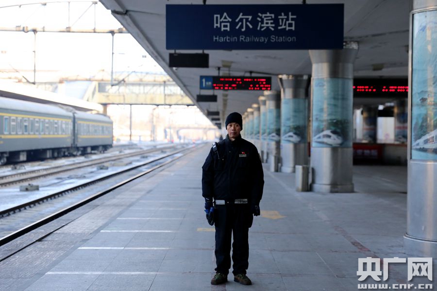 2016年2月6日哈爾濱火車站,欒福君在站臺立崗,等待統(tǒng)一口令下站臺接車。