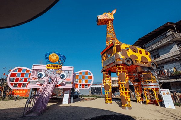 戶外設(shè)有大象溜滑梯、長頸鹿嘹望臺等裝置藝術(shù)。(圖片來源/宜蘭幸福轉(zhuǎn)運站)