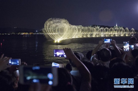 8月24日,游客在西湖邊欣賞西湖音樂噴泉。 新華社記者 鞠煥宗 攝 圖片來源:新華網