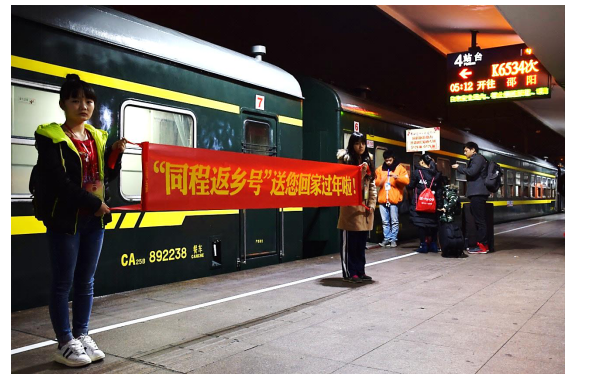 今年春運(yùn)期間,同程火車票聯(lián)合各方,承包了廣州南→貴陽北、廣州→邵陽兩趟列車將在穗務(wù)工人員、貧困大學(xué)生等漂泊在外的2000余名游子免費(fèi)送回家鄉(xiāng)。1月15日16點(diǎn)48分,廣州至邵陽的“同程返鄉(xiāng)號”愛心專列已經(jīng)成功抵達(dá)終點(diǎn)邵陽站。