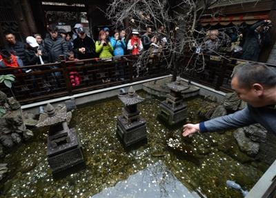 中午時分,記者又一次仔細(xì)觀察了水池,在游人拋投硬幣時,確實(shí)有一兩條金色的觀賞魚在石縫處游動著。在木制欄桿四周,正貼著“禁止倚靠欄桿”、“禁止投幣”等字樣!按汗(jié)游客爆滿,水池是從寬巷子到窄巷子的必經(jīng)之道,加上很多人在拋硬幣,頓時人滿為患。我們只好打印了幾張?zhí)嵝褟堎N起來!鞭k公室工作人員還表示,“等春節(jié)游客潮稍微退卻,天氣回暖,我們就要派人下水打撈這些硬幣,用于景點(diǎn)建設(shè)!