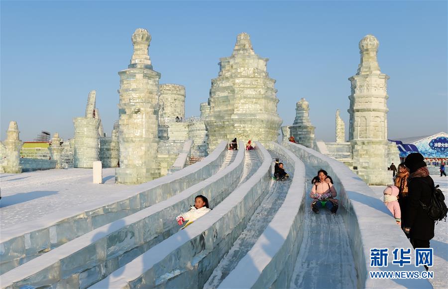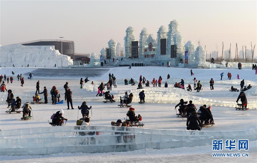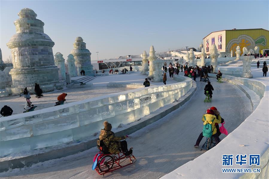 2月7日,游客在哈爾濱冰雪大世界園區(qū)的冰雪娛樂區(qū)游玩。春節(jié)長假后,哈爾濱冰雪大世界依舊游人如織,流光溢彩的冰建筑、巧奪天工的冰雕作品和百玩不厭的冰雪娛樂活動,讓天南海北的游客流連忘返。新華社記者 王建威攝 -