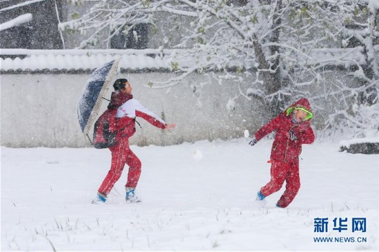 2月8日,在江蘇省淮安市盱眙縣淮河記事園,兩名孩子在雪中玩耍。受冷空氣影響,從2月7日起,全國(guó)多地陸續(xù)出現(xiàn)降雪天氣。 新華社發(fā)(周海軍 攝)