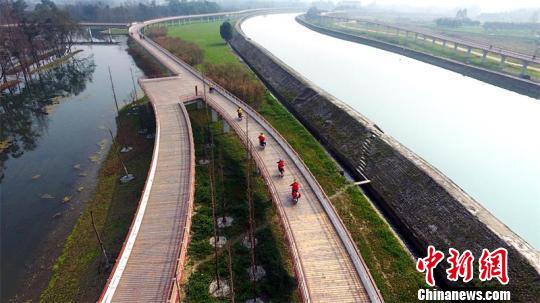 據(jù)了解,郫都區(qū)的三道堰水資源得天獨厚,都江堰內(nèi)江的兩大支流——柏條河、徐堰河縱貫鎮(zhèn)域全境,同時,這兩條河在三道堰的青杠村匯成府河,流向成都市區(qū),這里也是成都重要的飲用水源保護地和府河之源。為切實保護成都飲用水源,郫都區(qū)投資2600萬元在徐堰河畔打造了一個田園和水源結(jié)合的特色濕地公園,為防止水體污染,采取架空的設(shè)計方式,將人行“綠道”建在濕地公園之上,形成一條獨具特色的空中“綠道”。