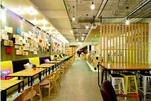 言幾又,看名字就知道,“言幾又”,合起來就是設(shè)計的“設(shè)”,這里玩兒的就是設(shè)計。不僅賣咖啡、簡餐,還賣書和創(chuàng)意商品。其實嚴格來說,這里并不是一家餐廳,而是一家創(chuàng)意書店。就餐區(qū)內(nèi)一個一條十多米長的“書墻”,也是這里的主要特色,讓文藝青年們在就餐的同時也能感受到富有鮮活生活方式的文學氣息。餐區(qū)內(nèi)通過使用簡單的材料組合,如木頭、磚頭以及混凝土地板平臺營造出令人放松的環(huán)境氛圍,傳遞出一種現(xiàn)代的簡潔新潮風格。