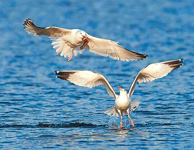 唐山市南湖龍泉寺東側(cè)的湖面上,兩只海鷗正嬉戲覓食。記者史自強(qiáng)攝影報道