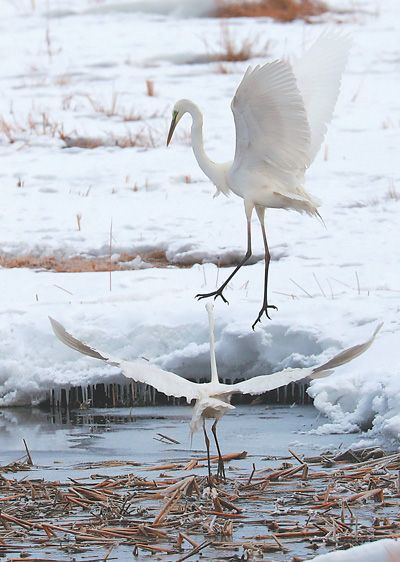 而在新疆哈巴河縣阿克齊濕地,雖然大面積的濕地還被茫茫積雪覆蓋,但在春風(fēng)的吹拂下,部分河面已開始解凍。20日清晨,多只白鷺在剛開始解凍的濕地覓食,嬉戲。