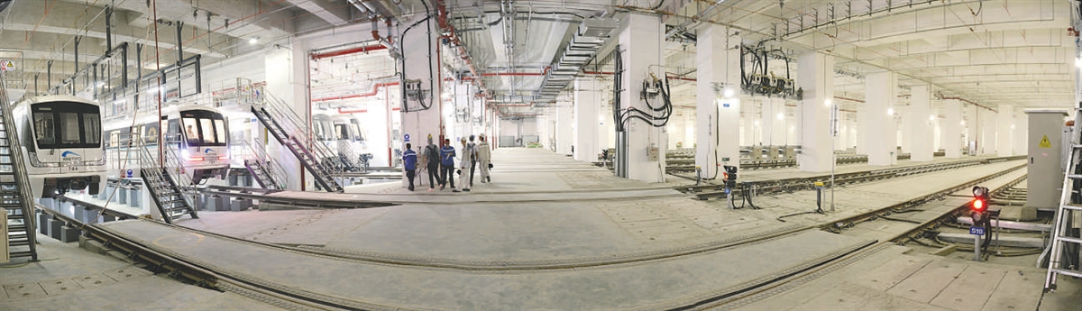 崔家店停車場負一層軌行區(qū)停放著一排地鐵7號線的列車。順著軌道往前、往后望,都沒有看到停車場的盡頭!拔覀儸F(xiàn)在看到的這部分只相當于崔家店停車場面積的四分之一。”成都地鐵運營公司新線部副部長張自鵬介紹,崔家店停車場不僅是成都地鐵首個地下雙層停車場,也是國內目前在建的最大規(guī)模全地下地鐵車輛綜合檢修基地!拔挥18米深的地下,分上下兩層。有聯(lián)絡線區(qū)、列檢庫及汽車庫區(qū)、運用庫區(qū)等,可同時停放76列地鐵列車!蓖\噲鲐撘弧⒇摱䦟榆壭袇^(qū)已正式移交并投入使用。