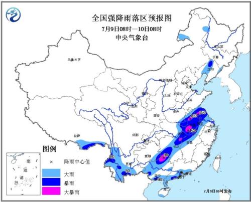 預(yù)計(jì),7月9日08時(shí)至10日08時(shí),江蘇、安徽、河南東南部、湖北東部、江西西北部、湖南西南部和東北部、貴州東南部、廣西北部和南部沿海、廣東南部沿海、云南中西部、遼寧西部等地的部分地區(qū)有大雨或暴雨,其中蘇皖北部、湖北東北部、廣西北部、湖南西南部等地局地有大暴雨(100~160毫米);上述部分地區(qū)有短時(shí)強(qiáng)降水,局地伴有雷暴大風(fēng)等強(qiáng)對(duì)流天氣,最大小時(shí)雨強(qiáng)可達(dá)20~40毫米,局地超過60毫米。