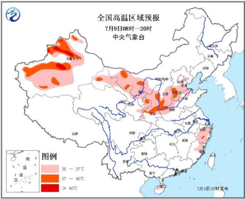 預(yù)計(jì),7月9日白天,內(nèi)蒙古西部、甘肅北部、寧夏北部、陜西中部、山西中南部、河北中南部、山東西北部、河南西北部、新疆西北部和南疆盆地等地有35℃以上的高溫天氣,其中,河北南部、山西西南部、陜西關(guān)中地區(qū)、新疆西北部和南疆盆地等地的部分地區(qū)最高氣溫可達(dá)37~39℃,局地可超過40℃。