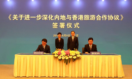 會見后,在李金早和林鄭月娥共同見證下,國家旅游局與香港特區(qū)商務(wù)及經(jīng)濟發(fā)展局在京簽署《關(guān)于進一步深化內(nèi)地與香港旅游合作協(xié)議》。