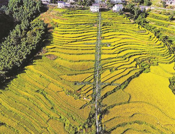 萬盛經(jīng)開區(qū)石林鎮(zhèn)石鼓村水稻成熟,仿佛給大地鋪上了一層金黃的地毯,農(nóng)舍與梯田相互映襯,交織成一幅美麗的豐收?qǐng)D畫。記者 熊明 通訊員 婁亞梅 攝