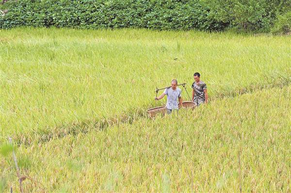 璧山區(qū)福祿鎮(zhèn)龍寶村,村民在金燦燦的稻田里穿行。特約攝影 謝捷 通訊員 曾清龍 攝