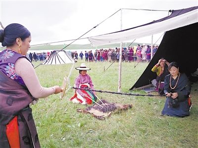 數(shù)千年來,生活在青藏高原逐水草而居的藏族,因時代的變遷與地域的差異,形成了豐富多彩的歷史文化。其中游牧文化作為一個藏文化的一個典型代表,灑落在草原深處。 8月28日,記者來到黃南藏族自治州澤庫縣草原,有幸目睹了當?shù)赜文撩袼孜幕姓故。從糌粑的制作、牦牛毛手工編織、唐卡繪畫,到酥油的制作,牧民轉(zhuǎn)場地落戶、藏餐的制作、再到皮袍的制作、羊毛制品的制作及和日石刻雕刻的過程,一頂頂帳篷內(nèi),一個個游牧民俗文化展示有生活場景,吸引著來自全國各地的參觀者。如今,隨著青海生態(tài)畜牧業(yè)試驗區(qū)建設(shè)的全面推進,千百年來,藏族在游牧生活中積淀的民俗文化正被一一挖掘,成為新時期草原民俗文化旅游的重要元素。