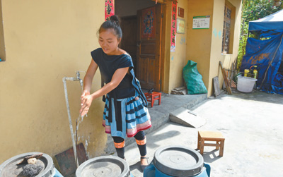 謝三英在新居用自來(lái)水洗手。