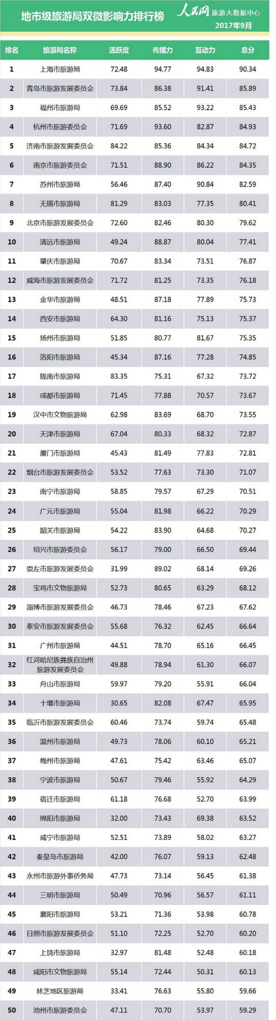 人民網(wǎng)輿情監(jiān)測室發(fā)布2017年9月全國地市級旅游局雙微影響力排行榜,榜單以全國范圍內(nèi)的地市級旅游局官方認(rèn)證微博、微信為評價(jià)對象,綜合考察活躍度、傳播力和互動力三個(gè)指標(biāo),通過海量數(shù)據(jù)分析和復(fù)雜的數(shù)理模型計(jì)算,全面、立體、準(zhǔn)確地反映旅游系統(tǒng)新媒體的發(fā)展?fàn)顩r。