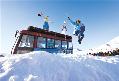 1月1日,在新疆喀納斯禾木村舉辦的潑雪節(jié)上,當(dāng)?shù)鼐用裨跒橛慰捅硌萏?/p>