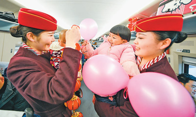 1月31日,南昌鐵路局南昌客運段由南昌西開往南京南的G1496次列車上,工作人員為車廂里的小旅客送上氣球等小禮品,營造快樂回家路。